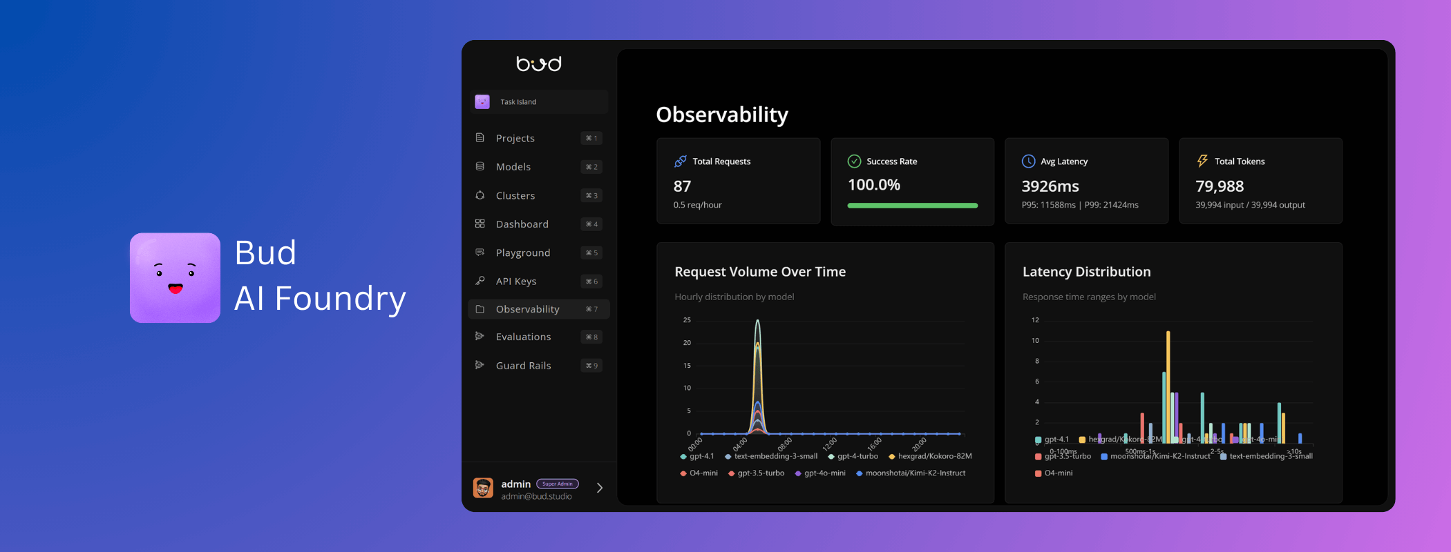 • Built-in Observability and Evaluation: To ensure models are performing as expected, Bud AI Foundry includes a full-featured Deployment Observability suite. This gives real-time insights into model performance, latency, and resource usage. Additionally, a dedicated Evaluations engine helps users benchmark model performance against specific criteria, ensuring the deployed models are meeting business objectives.