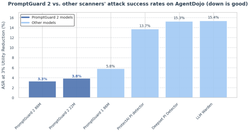 The graph below compares the performance of some of the SOTA guardrail systems against attack rates. PromptGuard 2 86M leads the chart with as low as 3.3% attack success rate. However, again, the model with input length of 512 tokens would perform well in the orchestrated benchmark conditions, but not sufficient for enterprise production ready deployment scenarios that deals with higher input context lengths and concurrent request.