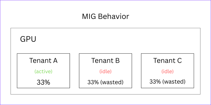 With MIG’s static allocation, idle instances can’t share resources. For example consider a scenario where 3 MIG instances are present but only one tenant is active. Here, Tenant A limited to 33% even though 67% of hardware resources are idle.